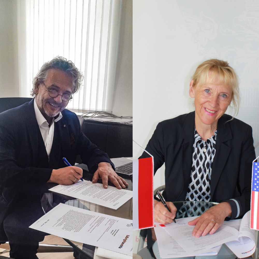 Signatories signing the new agreement between mdw and Fulbright Austria: (left to right) Johannes Meissl, vice rector for international affairs at mdw, and Barbara Weitgruber, 2022 chair of Fulbright Austria's board